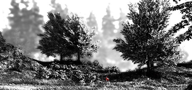 It's really more to do with walking through trees and long grass and feeling afraid. Not of what is there, but what might be there. What a world this is simply to move through - the waving of monochrome grass in a sudden breeze, the unexpected discovery of an abandoned fort within a valley, the maudlin beauty of a lone gravestone on a forest floor. The white. The black. The silence. The solitude. The sudden shattering of the solitude and silence. Audio cues are as important to Betrayer as those occasional flashes of red are - horns and growls denote that the enemy is aware of you, and the stealth options afforded by your bow are for now lost to you. Faint chimes lead you to clues and loot. The Bell means you have moved into Night, where it is dark and full of terrors.