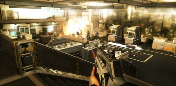 Quinns: Mm. Believable is the word I'd use. Without wanting to give anything away, the game's tutorial level sees you being steered around your company's laboratory, meeting some of the more important members of the game's cast (who are all on edge as your biotech firm is about to go public with some heavy shit) and then being fed all the combat mechanics when the building reports some intruders. The annoying part of all this is that the levels afterwards are still under embargo, so all we can do now is report that the tutorial was extremely linear. But then, so was Deus Ex's.