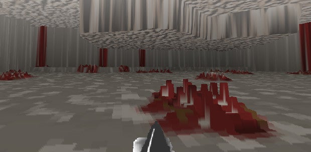 The world is all sharp angles and crude geometry, ceilings with interesting shapes jutting out of them and floors which rise for no real reason. Littering the place are mounds of red and brown with white spikes, abstract dead Imp carcasses or gibbed bodies that bleed and merge into the ground and seem as much part of the level as the walls.