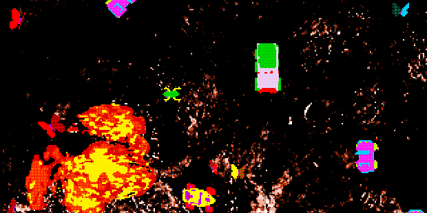 Set in an apocalyptic future where roads and cars are everything, Froggy's the tale of one brave eponymous frog trying to stay alive. Frogger's a clear reference, but that's mostly visual. Rather than simply jumping across lanes, you're dashing about all over trying to devour butterflies and dodge the cars that zoom about and leave giant fireballs as they smash into each other. Mostly it's the explosions that'll get you, but only if you're hasty.