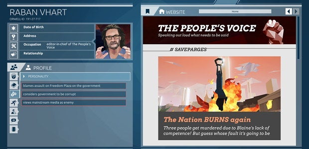 Orwell is the very on-the-nose name for a game about surveillance, government snooping, and the pitfalls of such systems. Set in a fictional country (The Nation), with a fictional government (The Party), surrounded by other fictional nations (Parges, Ustvakia, Gentria), (making it slightly peculiar that it then features actual Germany), terrorism is afoot, and you’re tasked with using snoopy tech to investigate potential suspects, and perhaps even influence the findings to your own end.