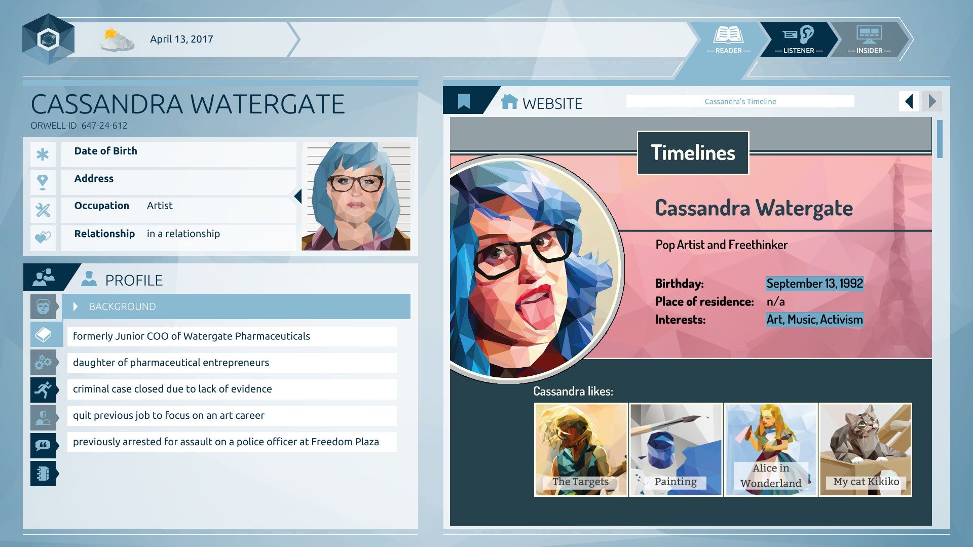 You are a volunteer given access to the government’s new Orwell system, an ironically named surveillance tool that allows users to access personal information about citizens, collating from both their public social media accounts and snooped details from their private communications. The peculiarity - and pretty insurmountable conceit for the game - is that you have full access to all the details about a suspect, but your supervisor is (legally?) only allowed to look at the snippets you send him. It’s to prevent the government from being too powerful, see? By, um, giving all the information about people’s privacy to some person. And it’s through this conceit that the nature of how you can potentially manipulate the data is made possible