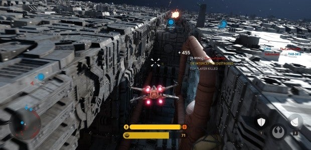In theory, Death Star is precisely what everyone wanted from Battlefront originally. In practice, things are a little more complicated. The initial Star Destroyer engagement is a far better fit for Battlefront’s aerial combat than the terrestrial maps, as you aren’t constantly worrying about piling into the ground like a big space dart, (although asteroids and the Star Destroyer itself mean there are plenty of other obstacles to keep you on your toes). It helps that the flight controls actually work on PC now. And while it hardly rivals the classic Star Wars flight sims, with a full group of players it is surprisingly challenging. I was getting shot out of the sky like an obese duck until I learned to weave and roll and use what little cover is available to shake off pursuers and evade their target-locking systems.