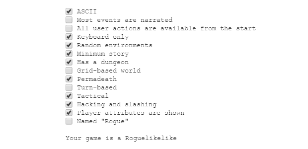 Simply go down the list and tick off any aspects found in your game - permadeath, turn-based, hacking and slashing, random environments, ASCII, being named Rogue, and so on - then the handy AND VERY SERIOUS tool will spit out your game's Rogue rating. Then take that finding and correct your marketing materials, you scamps.